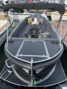 De VanVossen 650 e-tender is erg stoer en heeft een gezellige rondzit. Achter bevind zich en ruim zit- ligdek en het zwemplateau. Totaal grijs gespoten, speciale editie. Varen in Loosdrecht
