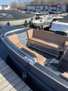 De VanVossen 650 e-tender is erg stoer en heeft een gezellige rondzit. Achter bevind zich en ruim zit- ligdek en het zwemplateau. Totaal grijs gespoten, speciale editie. Varen in Loosdrecht